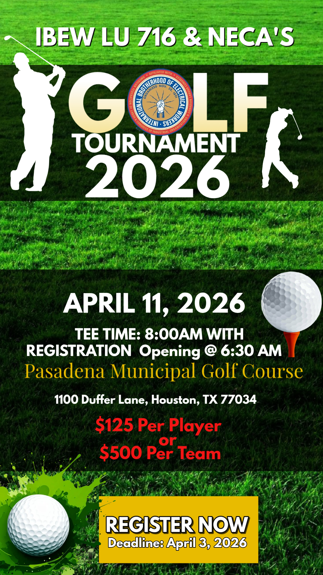 Any Members wanting to remain on the Out Of Work Book must resign annually. Resigns must be done via email @ resignbook@ibew716.net. , fax @ (713)-868-6342 or in person. Please submit a copy of your dues receipt and state that you are doing your annual resign.